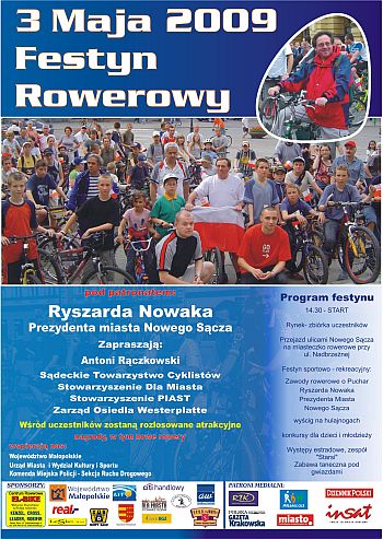 W niedzielę, 3 maja – spod nowosądeckiego ratusza wyruszy tradycyjny peleton rowerzystów. Podobnie jak przed rokiem radny Antonii Rączkowski i Prezydent Nowego Sącza Ryszard Nowak zapraszają wszystkich mieszkańców do udziału w „Festynie Rowerowym”. Początek o godz. 14.30 na sądeckim Rynku. Zakończenie oraz wiele konkursów, gier i zabaw zaplanowano na Miasteczku Rowerowym.