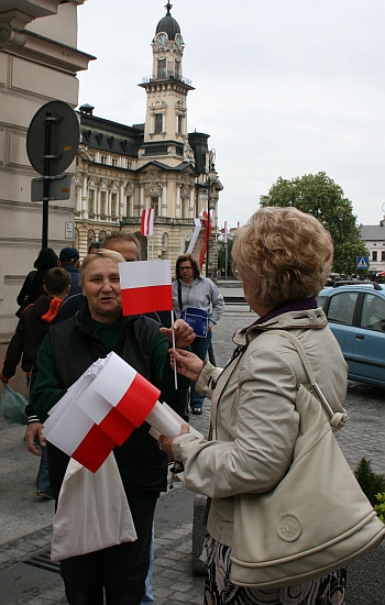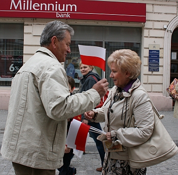Wiceprezydent Bożena Jawor, wspomagana przez harcerzy, wręczała małe chorągiewki na sądeckim Rynku oraz ul. Jagiellońskiej. Kilka osób skorzystało z okazji spotkania z wiceprezydent aby podziękować władzom miasta za pielęgnowanie tradycji patriotycznych oraz dbałość o estetykę miasta.
