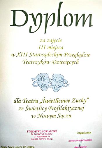 W Starym Sączu, odbył się XIII Starosądecki Przegląd Teatrzyków Dziecięcych, którego organizatorem było Starostwo Powiatowe w Nowym Sączu, W Przeglądzie wzięło udział 29 zorganizowanych i świetnie przygotowanych grup teatralnych z terenu Sądecczyzny. Wśród laureatów Konkursu znalazła się również grupa teatralna „Świetlicowe Zuchy”, działająca przy Świetlicy Środowiskowej na osiedlu Szujskie w Nowym Sączu, prezentując spektakl pt.: „Drzewo Życia”. Ośmioosobowy zespół uczestników zajęć w Świetlicy otrzymał dyplom i nagrodę zajmując III miejsce w Przeglądzie.