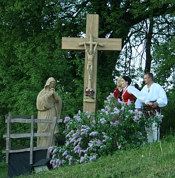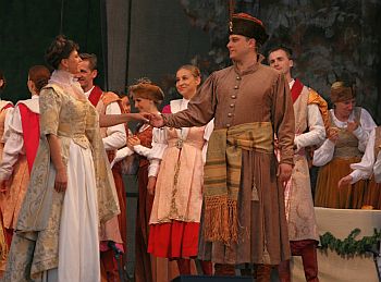 Podczas przedstawienia nie zabrakło ciekawych elementów scenografii wśród których znalazły się: kapliczka i drewniany krzyż otoczony krzewem bzu. Ponadto operę ubarwiały powozy zaprzęgnięte w konie, którymi zajechali na scenę goście weselnego orszaku.