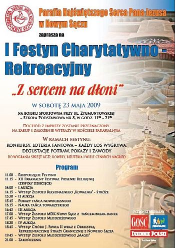 W najbliższą sobotę, 23 maja, Parafia Najświętszego Serca Jezusowego zaprasza serdecznie wszystkich mieszkańców na I Parafialny Festyn Charytatywno - Rekreacyjny pod hasłem "Z sercem na dłoni". Spotkanie rozpocznie się o godz. 11.00 na boisku sportowym Szkoły Podstawowej Nr 8 w Nowym Sączu a zakończy około godz. 21.00. W programie min. występy, zabawy, licytacje oraz loteria, w której każdy los wygra. Dochód z imprezy przeznaczony zostanie na zakup i założenie witraży w kościele parafialnym.