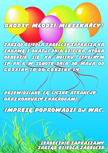 Taniec z balonikiem, rzut do celu, wędrujące jajko, karmienie kisielem – to tylko niektóre konkurencje, które przygotował Zarząd Osiedla Zabełcze dla wszystkich najmłodszych mieszkających na tym osiedlu. Zabawa z okazji Dnia Dziecka rozpocznie się o godz. 10.00 na boisku szkolnym SP nr 6. Organizatorzy zaplanowali między innymi konkursy plastyczne: „Nowy Sącz w oczach dzieci”, „Namaluj swój portret” oraz „Odbudujmy sądecki zamek”. Ponadto dzieciaki budować będą budę dla psa. W samo południe dzieci złożą sobie życzenia i bawić się będą dalej. Na 12.30 zaplanowano konkurs ”Bajkowa dorysowanka” oraz „Zabawne recytacje”. Nie zabraknie dobrej muzyki w wykonaniu samych uczestników zabawy oraz przygotowanej przez DJ WACA. Dla wszystkich przygotowano niespodzianki a za udział w konkursach dzieci nagradzane będą upominkami.