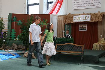 Na zakończenie spotkania goście obejrzeli spektakl przygotowany przez uczniów szkoły „Przed Sklepem Jubilera” oraz wystawę poświęconą pamięci Jana Pawła II – patrona szkoły.