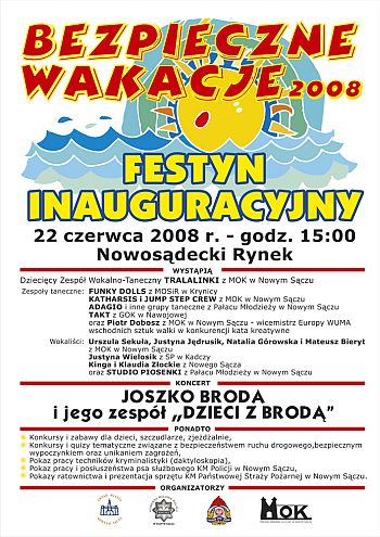 Tegoroczne wakacje rozpocznie wielki festyn, który odbędzie się już w najbliższą niedzielę na płycie sądeckiego Rynku. Początek zaplanowano na godzinę 15.00. W finale wystąpi Joszko Broda i jego zespół „Dzieci z Brodą”. Koncert poprzedzą występy młodych artystów z Miejskiego Ośrodka Kultury. Zaprezentują się: Tralalinki, zespoły taneczne: Funki Dolls z Krynicy, Katharsis i Jump Step Crew z MOK, z MOK w Nowym Sączu- wicemistrz Europy WUMA wschodnich sztuk walk. Śpiewać będą soliści: Urszula Sekuła, Justyna Jędrusik, Natalia Górowska i Mateusz Bierut z MOK w Nowym Sączu, Justyna Wielosik z SP w Kadczy, Kinga i Klaudia Złockie z Nowego Sącza oraz Studio Piosenki z Pałacu Młodzieży w Nowym Sączu. Ponadto podczas Festynu Inauguracyjnego Bezpieczne Wakacje 2008 odbędzie się wiele konkursów, zabaw, quizów i pokazów. Natomiast od poniedziałku 23 czerwca , jak co roku, na dzieci czeka całe mnóstwo atrakcji. Zajęcia sportowe na hali sportowej i krytej pływalni oraz ściance wspinaczkowej, wycieczki nad Jezioro Rożnowskie wraz z rejsem statkiem po akwenie, a także do Krynicy na Górę Parkową, gdzie czekają na dzieci atrakcje na zjeżdżalniach.