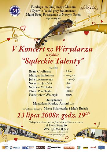 Po raz kolejny w wirydarzu Ojców Jezuitów zaprezentują się utalentowani młodzi artyści z Nowego Sącza. Koncert zorganizowany po raz piąty przez Fundację im. Doktora Jerzego Masiora będzie ciekawą alternatywą na niedzielny wieczór 13 lipca. O godzinie 19.00 na dziedzińcu klasztoru Ojców Jezuitów, przy ulicy Piotra Skargi zabrzmią kompozycje Andre Messagera, Vittorio Monti, Georga Friedricha Händela, a także recytowane będą wiersze księdza Jana Twardowskiego. Radny Józef Kaczmarczyk, który jest organizatorem koncertów w wirydarzu przypomina, że celem przeprowadzania prezentacji młodych artystów - oczywiście poza wartościami i doznaniami natury duchowej - jest promowanie młodych utalentowanych artystycznie sądeczan, udzielanie wsparcia uzdolnionym artystycznie uczniom w celu wyrównania szans edukacyjnych, upamiętnienie twórczości artystycznej i literackiej dra Jerzego Masiora, promocja sztuki, współpraca z wolontariatem oraz inspirowanie ruchu młodzieży wokół celów Fundacji.