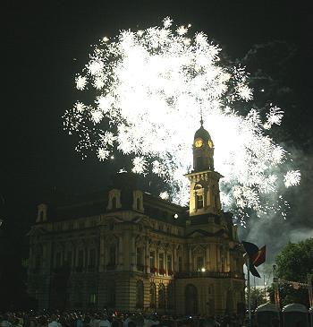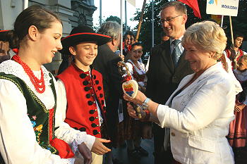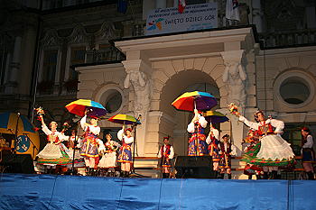 XVI Festiwal Święto Dzieci Gór rozpoczął się od wejścia dziecięcego korowodu na płytę sądeckiego Rynku. Uroczystemu orszakowi przewodził powóz, w którym pod ratusz przybyli organizatorzy imprezy. Z balkonu wieży ratuszowej popłynęły dźwięki wydobywane przez Józefa Brodę z ogromnej bazuny. Zanim rozpoczęto prezentacje poszczególnych zespołów, przybyłych do Rynku gości i mieszkańców miasta przywitał prezydent Ryszard Nowak. W chwilę później w ręce młodych artystów powędrowały symboliczne klucze do bram miasta i odtąd dzieci z różnych zakątków świata przejęły na tydzień władanie Nowym Sączem.