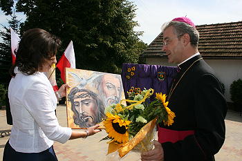 Wszyscy zaproszeni goście otrzymali od grona pedagogicznego i uczniów bukiety z kwiatów słonecznika. Ksiądz biskup Lechowicz otrzymał także ikonę „napisaną” przez uczniów. Dostojnik zdziwił się nieco, że już dzieci w szkole podstawowej uczą się pisać ikony. Może w tej szkole wyrośnie następny Rublow? – zastanawiał się biskup. Tego Wam życzę – zakończył z uśmiechem.