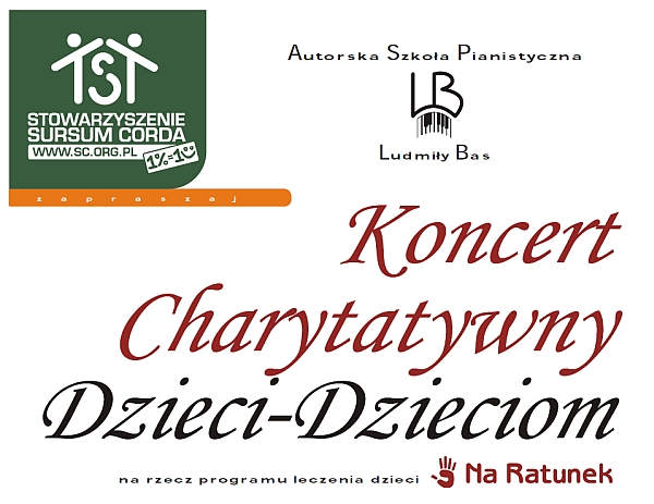 Stowarzyszenie SURSUM CORDA oraz Autorska Szkoła Pianistyczna Ludmiły Bas zapraszają na Koncert Charytatywny "Dzieci - Dzieciom", z którego dochód zostanie przeznaczony na realizację programu leczenia dzieci "Na Ratunek".