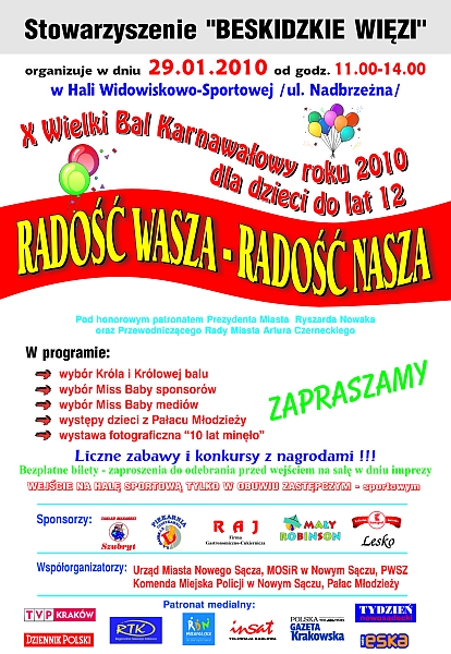 Zabawa odbędzie się w Hali Widowiskowo Sportowej przy ul. Nadbrzeżnej, w godzinach od 11:00-14:00. Bal jest bezpłatny, a wszystkie zainteresowane dzieci mogą odbierać zaproszenia przed wejściem na salę w dniu imprezy. Bal karnawałowy dla dzieci odbywa się pod patronatem Prezydenta Nowego Sącza Ryszarda Nowaka oraz Przewodniczącego Rady Miasta Artura Czerneckiego. Organizatorem spotkania jest Stowarzyszenie "Beskidzkie Więzi".