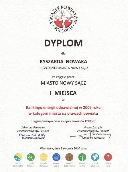 Zarząd Związku Powiatów Polskich przekazał na ręce Prezydenta Miasta Ryszarda Nowaka Dyplom Uznania za zajęcie przez Nowy Sącz 1 miejsca w Rankingu Energii Odnawialnej w 2009 r. w kategorii miast na prawach powiatu zorganizowanym przez Związek Powiatów Polskich. Nowy Sącz zgromadził na koniec 2009 r. 4145 pkt. wyprzedzając m.in. Słupsk (1415 pkt.), Rzeszów (1155 pkt.) i Kraków (1060 pkt.). Przy uwzględnieniu wyników 111 sklasyfikowanych ogółem samorządów w poszczególnych kategoriach (powiaty, miasta na prawach powiatu, gminy miejskie i miejsko-wiejskie, gminy wiejskie) Nowy Sącz uzyskał trzeci wynik w Polsce.