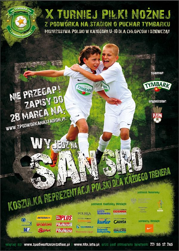 Rozpoczęły się zapisy do X Turnieju Piłki Nożnej „Z podwórka na stadion o Puchar Tymbarku”. Najlepsze drużyny chłopców i dziewcząt, które zdobędą Puchar Tymbarku oraz tytuł Mistrzów Polski w kategorii U-10, w nagrodę spełnią swoje marzenia i wyjadą na legendarny stadion San Siro. Po drodze czeka na nich fantastyczna piłkarska przygoda oraz wiele niezapomnianych atrakcji.