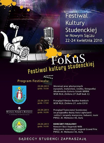 Już jutro tj. 22 kwietnia 2010 r. o godz. 16.00 rozpoczyna się Festiwal Kultury Studenckiej "FoKuS". Przez trzy dni studenci Państwowej Wyższej Szkoły Zawodowej oraz Wyższej Szkoły Biznesu-NLU, a także uczniowie innych szkół wyższych (lub filii) i laureaci niektórych festiwali szkół średnich, rywalizować będą w wielu dyscyplinach kultury.