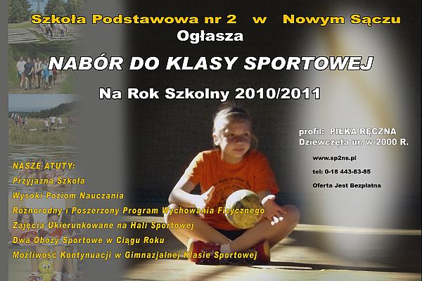 Szkoła Podstawowa nr 2 w Nowym Sączu ogłasza nabór do klasy sportowej – profil: piłka ręczna. Oferta edukacyjna dotyczy dziewcząt urodzonych w 2000 r. Ponadto szkoła oferuje wysoki poziom nauczania, zajęcia na obiektach sportowych i dwa obozy sportowe w ciągu roku. Więcej informacji w sekretariacie szkoły, lub pod numerem telefonu:18 443-83-85
