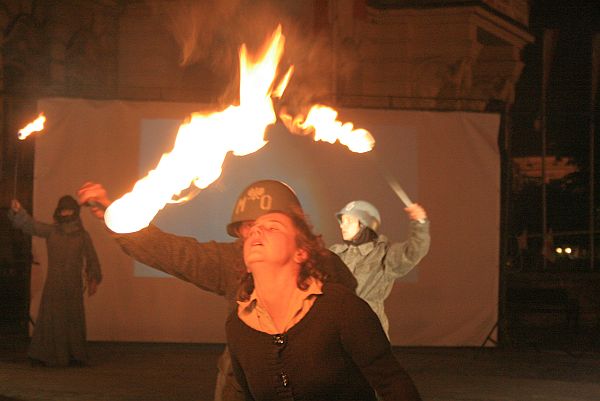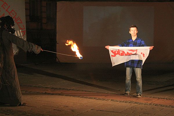 Wieczorem na sądeckim Rynku Teatr "W Przestrzeni" zaprezentował spektakl zatytułowany "Sierpień 1980- sierpień 2010"