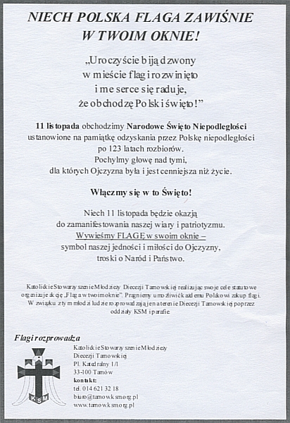 W sądeckim ratuszu odbyła się konferencja prasowa, podczas której przedstawiono ideę akcji „Niech Polska Flaga zawiśnie w naszych oknach”. W akcje włączyło się Katolickie Stowarzyszenie Młodzieży Diecezji Tarnowskiej. „Dla mnie jest to ogromna radość, że młodzi ludzie podjęli się zadania, aby propagować naszą polską flagę. Powinniśmy zrobić wszystko, aby w każdym domu, w oknie, w czasie świąt ta flaga była eksponowana - powiedziała wiceprezydent Bożena Jawor. Dlatego w okresie świat, tych radosnych świąt, oprócz uczestnictwa koncertach powinniśmy z radością tą flagą epatować” - dodała wiceprezydent.