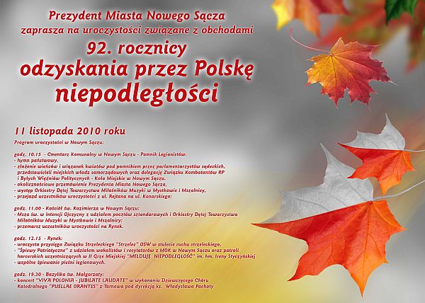 W czwartek 11 listopada, w Nowym Sączu odbędą się obchody 92. rocznicy odzyskania przez Polskę niepodległości. O godzinie 10.15 na Cmentarzu Komunalnym, przy Pomniku Legionistów odbędzie się złożenie wiązanek kwiatów przez sądeckich parlamentarzystów, przedstawicieli władz samorządowych, delegacje organizacji kombatanckich. Zaplanowano również występ Orkiestry Dętej Towarzystwa Miłośników Muzyki w Mystkowie i Mszalnicy.