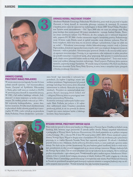 W rankingu zaprezentowano sylwetki najwybitniejszych, zdaniem „Wspólnoty”, samorządowców mijającej kadencji. Jak pisze redakcja „ludzi, którzy potrafili działać na najwyższych obrotach, realizując ambitne cele i inspirując swoim przykładem innych do działania. To za ich sprawą kierowane przez nich samorządy dokonały w ostatnich trzech latach największego skoku finansowego, gospodarczego i inwestycyjnego”.