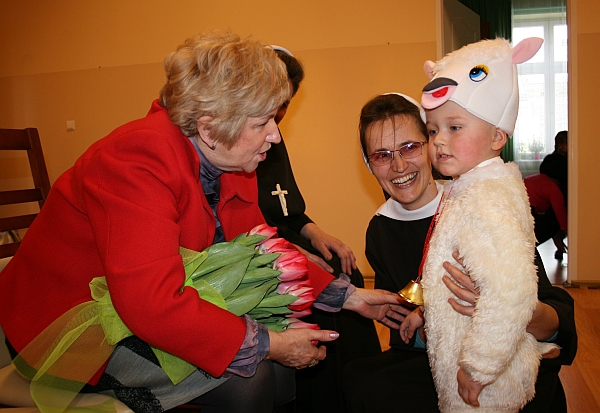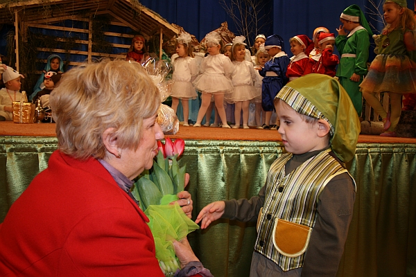 Na widowni zasiadły babcie, dziadkowie i nauczyciele przedszkolaków. Wiceprezydent, wzruszona grą małych aktorów, podziękowała za perfekcyjnie przygotowane jasełka, pogratulowała dzieciom ogromnego talentu i na ręce Jasia, który wystąpił w roli Koszałka-Opałka, przekazała im słodką niespodziankę.