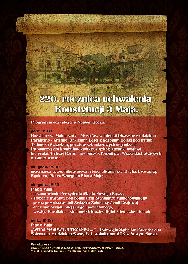 Już za kilka dni przypada 220. rocznica uchwalenia Konstytucji 3 Maja. Z tej okazji, tradycyjnie jak co roku, w Nowym Sączu odbędą się uroczystości, które o godz. 11.00 rozpocznie msza św. w intencji Ojczyzny odprawiona w Bazylice św. Małgorzaty. Około godz. 12.00 uczestnicy uroczystości przemaszerują na Plac 3 Maja, gdzie prezydent Ryszard Nowak wygłosi okolicznościowe przemówienie. Odbędzie się również występ Parafialno - Gminnej Orkiestry Dętej z Łososiny Dolnej. Następnie przedstawiciele Związku Żołnierzy Armii Krajowej oraz samorządu miejskiego i powiatowego złożą kwiaty pod pomnikiem upamiętniającym postać Stanisława Małachowskiego, który znajduje się na Placu 3 Maja.