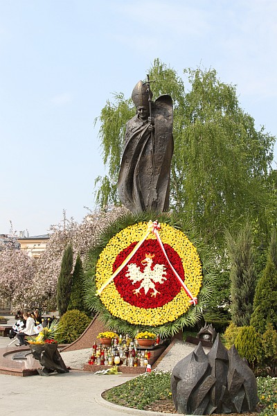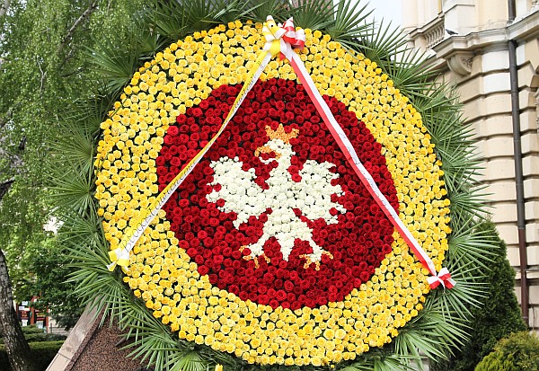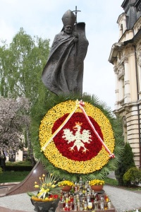 Ogromny, o średnicy ponad 2,5 metra wieniec w barwach narodowych z orłem w koronie zdobi pomnik Papieża Jana Pawła II w Nowym Sączu. Do wykonania wieńca zużyto około 3 tysiące kwiatów. Zewnętrzną część ozdobiono gałązkami palmowymi oraz żółtymi różami, środek wypełniają czerwone róże, a orzeł w koronie misternie wykonany jest z białych róż.