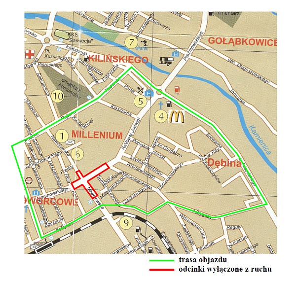 Objazd poprowadzony będzie ulicami: Kolejową, Łukasińskiego, 1 Brygady, Al. Piłsudskiego, Husarską, Rejtana, Grodzką, Al. Batorego (projekt organizacji ruchu poniżej).