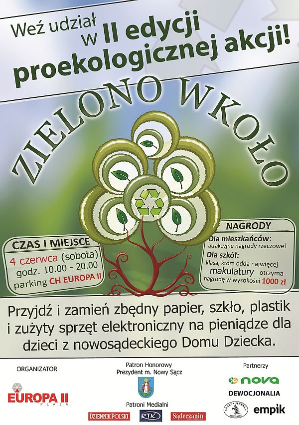 4 czerwca w godz. 10.00 – 20.00 odbędzie się II edycja akcji proekologicznej „Zielono wkoło” organizowanej przez Centrum Handlowe EUROPA II. Celem przedsięwzięcia jest uświadamianie mieszkańców miasta, zwłaszcza tych najmłodszych, o potrzebie segregacji surowców wtórnych.