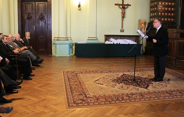 Prof. Feliks Kiryk – przewodniczący kolegium redakcyjnego wydawnictwa przedstawił pokrótce nowy tom, podkreślił też, iż niewiele miast może pochwalić się wydawnictwem z takimi tradycjami, a także mecenatem Urzędu i prezydentów, na czele z prezydentem Ryszardem Nowakiem i Jerzym Gwiżdżem, który 20 lat temu wprowadził wydawnictwo do budżetu miasta, dzięki czemu może się ukazywać i rozwijać.