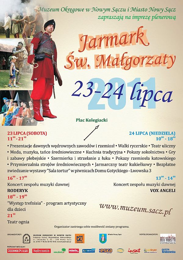 W sobotę, od godz. 11.00 do 21.30 oraz w niedzielę od godz. 10.00 do 18.00 będzie można poczuć się tak jak na dawnych jarmarkach. Nie zabraknie stoisk z ciekawymi wyrobami, potrawami i rękodziełem ludowym. Inscenizacje, pokazy i koncerty uatrakcyjniać będą czas spędzony na jarmarku. W sobotę Jarmark Św. Małgorzaty, którego organizatorami są Muzeum Okręgowe w Nowym Sączu i Miasto Nowy Sącz zakończy niezwykle efektowny teatr ognia. W niedzielę będzie można posłuchać muzyki dawnej w wykonaniu Vox Angeli.
