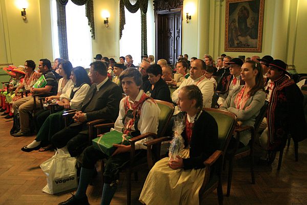 Następnie już w ratuszu Antoni Malczak - Dyrektor MCK Sokół zaprezentował przedstawicielom władz miasta i regionu uczestników ŚDzG. W kolejności, w jakiej będziemy je oglądać, kamrackie zespoły wymieniały się upominkami z lokalnymi decydentami.