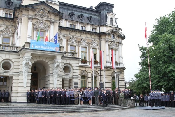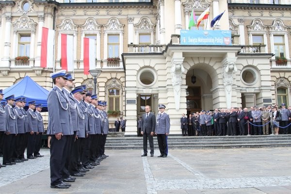 Podczas uroczystości głos zabrał również Komendant Główny Policji gen. insp. Andrzej Matejuk. „Chciałbym, w obecności tylu dostojnych gości pogratulować małopolskim funkcjonariuszom zatrzymania sprawcy wybuchów w Krakowie. Policjanci małopolscy i ci w całym kraju, swój profesjonalizm potwierdzają w codziennych obowiązkach. Cieszę się bardzo, że rośnie skuteczność małopolskich policjantów w zatrzymywaniu sprawców przestępstw pospolitych, tych najbardziej dokuczliwych dla mieszkańców. Rośnie aktywność funkcjonariuszy w zwalczaniu przestępczości narkotykowej, gospodarczej. Staramy się ograniczać przestępczość wśród nieletnich. Ważne jest to, że te sukcesy widzą mieszkańcy, bo to właśnie oni w ponad 60 procentach dobrze oceniają skuteczność policji. W ponad 64 procentach dobrze oceniają służbę policjanta, w swoim miejscu zamieszkania. Za to gorąco, wszystkim policjantkom i policjantom dziękuję. Małopolscy funkcjonariusze doskonale wiedzą, że bycie policjantem to nie tylko zawód, ale przede wszystkim misja służenia innym. Jestem przekonany, że rosnące wymagania wobec policji ze strony społeczeństwa będziemy się starać dobrze realizować” - podkreślił komendant.