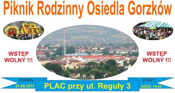W najbliższą niedzielę 21 sierpnia 2011 r., na placu przy ul. Reguły 3, odbędzie się Piknik Rodzinny Osiedla Gorzków. Na imprezę, zorganizowaną w ramach programu aktywności lokalnej projektu systemowego „Twoja AKTYWNOŚĆ szansą na sukces!” i współfinansowaną przez Unię Europejską w ramach Europejskiego Funduszu Społecznego zapraszają Miejski Ośrodek Pomocy Społecznej w Nowym Sączu oraz Zarząd Osiedla Gorzków. Impreza skierowana do mieszkańców osiedla rozpoczyna się o godz. 14.00.