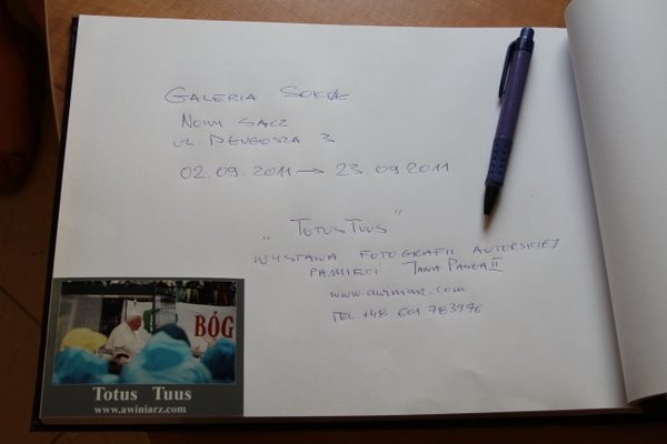 „Chciałbym, aby ta wystawa wzbudzała refleksje nad nauczaniem Jana Pawła II” – w ten sposób Andrzej Winiarz zachęcał do odwiedzania wystawy swoich fotografii pn. „Totus Tuus” podczas wernisażu, który odbył się w Galerii SOKÓŁ. Organizatorem wystawy jest Światowe Stowarzyszenie Kultury Chrześcijańskiej im. Jana Pawła II. Wystawa prezentowana jest w ramach VIII Światowego Festiwalu Dziedzictwa Kultury Chrześcijańskiej. Mecenat nad Festiwalem sprawuje prezydent Nowego Sącza Ryszard Nowak.