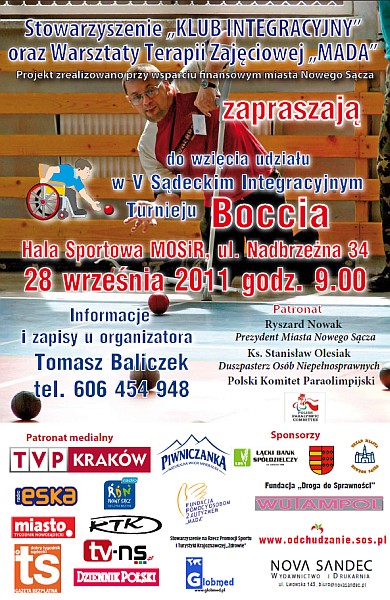 W środę 28 września 2011 roku, w hali sportowej przy ulicy Nadbrzeżnej 34 w Nowym Sączu, odbędzie się V Turniej Boccia dla osób niepełnosprawnych organizowany przez Stowarzyszenie „Klub Integracyjny” oraz Warsztaty Terapii Zajęciowej "MADA" – poinformowano podczas konferencji prasowej z udziałem Leszka Langera, Pełnomocnika ds. Osób Niepełnosprawnych, Tomasza Baliczka, koordynatora turnieju oraz Jana Reszkiewicza, kierownika WTZ „MADA”. Początek zawodów o godz. 9.00.
