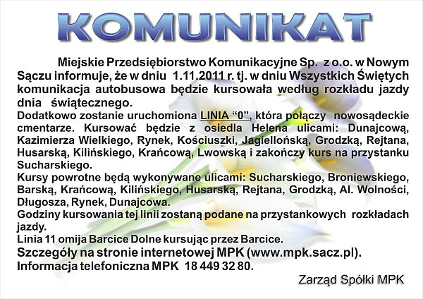1 listopada, tradycyjnie MPK dodatkowo uruchamia linię "O", która połączy sądeckie cmentarze. Komunikacja autobusowa będzie kursowała według rozkładu jazdy dnia świątecznego.