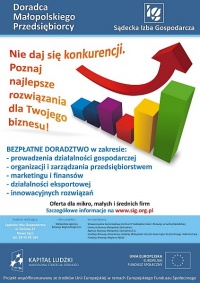 Usługi doradcze realizowane są w ramach projektu pn. „DORADCA MAŁOPOLSKIEGO PRZEDSIĘBIORCY” - Program Operacyjny Kapitał Ludzki, Działanie 8.1 „Rozwój pracowników i przedsiębiorstw w regionie”, Poddziałanie 8.1.1 „Wspieranie rozwoju kwalifikacji zawodowych i doradztwo dla przedsiębiorstw”. Celem projektu jest rozwój przewagi konkurencyjnej mikro, małych i średnich małopolskich przedsiębiorstw, dzięki rozwiązywaniu problemów biznesowych, dostosowując ich firmy do aktualnych wymogów rynku.