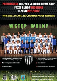 Miejski Klub Sportowy Sandecja Nowy Sącz, Urząd Miasta Nowego Sącza oraz Stowarzyszenie Kibiców Sandecji serdecznie zapraszają kibiców i mieszkańców na prezentację drużyny Sandecji przed rundą wiosenną sezonu 2011/2012. Prezentacja odbędzie się w najbliższą sobotę 10 marca o godzinie 18.30 w hali widowiskowo-sportowej MOSiR w Nowym Sączu przy ul. Nadbrzeżnej 34.