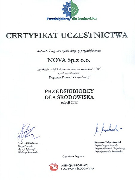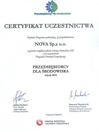 Otrzymanie certyfikatu „Przedsiębiorcy dla Środowiska” jest dowodem i znakiem jakości potwierdzającym wysoki standard prowadzenia działalności i zaangażowanie firmy w propagowanie ekologii.
