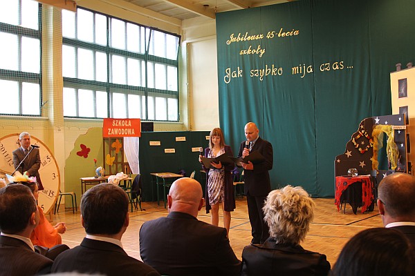 Prezydent Ryszard Nowak wręczając prezent na ręce dyrektora szkoły Waldemara Bogacza, powiedział: „Proszę przyjąć moje jubileuszowe gratulacje, a także podziękowania za pracę Pana, całego grona pedagogicznego, wszystkich pracowników. Dzisiaj mieliśmy okazję zapoznać się z dorobkiem szkoły, jak również dostrzec ile trudu trzeba włożyć, żeby tą młodzież prowadzić, przysposobić ją do życia. To bardzo wielkie i ciężkie zadanie, które jak widzę wykonujecie bardzo dobrze. Sprostaliście wymaganiom, które przed wami stawiają również rodzice, którzy w wasze ręce oddają swoje dzieci. Za to wszystko dziękuję i zapewniam o dalszej życzliwości i opiece”.