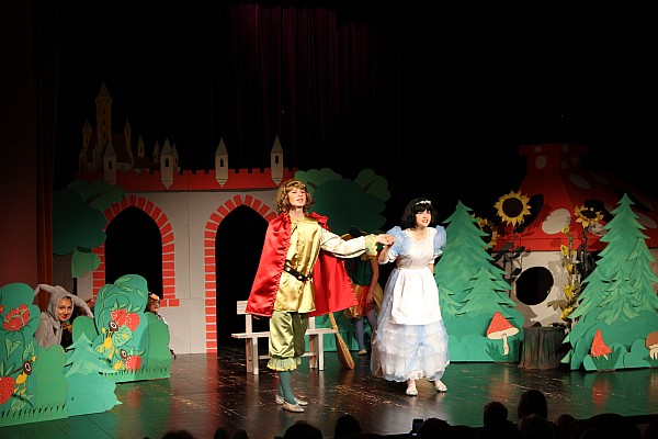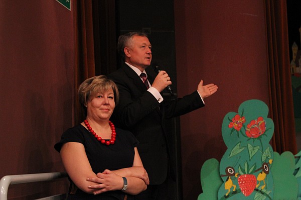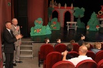 Następnie Józef Markiewicz – dyrektor Miejskiego Ośrodka Pomocy Społecznej w Nowym Sączu oraz Henryk Leśniara – dyrektor Ośrodka Wsparcia i Terapii Rodzin zaprosili gości do obejrzenia przedstawienia teatralnego pt. „Królewna Śnieżka i krasnoludki” w wykonaniu grupy teatralnej „CUDOKI – SZUROKI”. Po przedstawieniu dzieci odpowiadały na pytania dotyczące bajki, za co od młodych aktorów otrzymywały ogromne pluszaki.