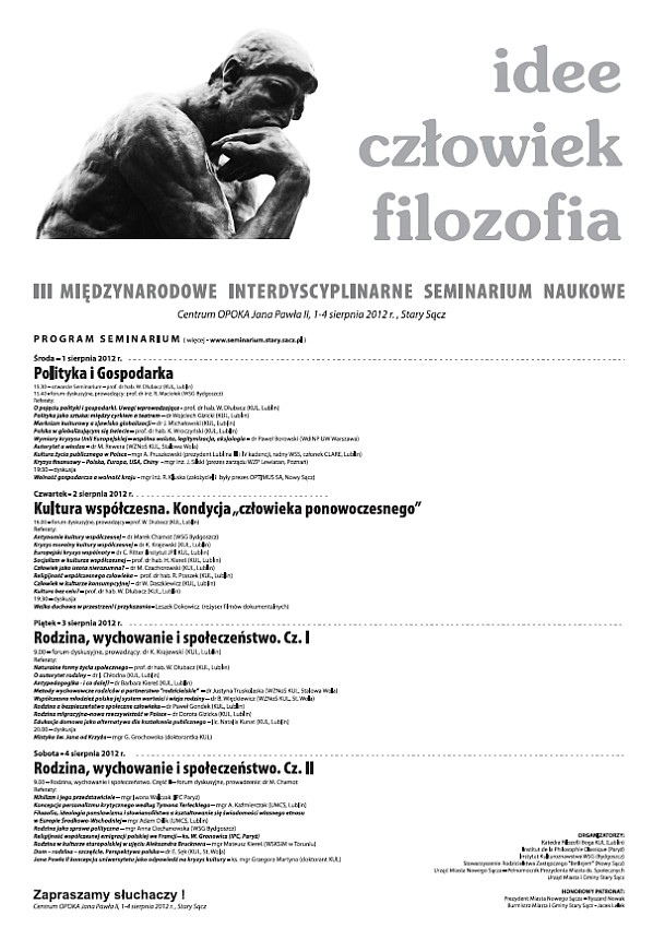 Na spotkanie zapraszają organizatorzy: Katedra Filozofii Boga KUL, paryski Instytut de la Philosophie Classique, Instytut Kulturoznawstwa Wyższej Szkoły Gospodarki w Bydgoszczy, Stowarzyszenie Rodzicielstwa Zastępczego „Betlejem w Nowym Sączu, Urząd Miasta Nowego Sącza – Pełnomocnik Prezydenta Miasta ds. Społecznych oraz Urząd Miasta i Gminy Stary Sącz.