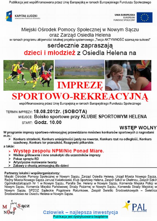 Miejski Ośrodek Pomocy Społecznej w Nowym Sączu oraz Zarząd Osiedla Helena, w ramach programu aktywności lokalnej projektu systemowego „Twoja AKTYWNOŚĆ szansą na sukces!”, serdecznie zapraszają dzieci i młodzież z osiedla Helena na IMPREZĘ SPORTOWO-REKREACYJNĄ, współfinansowaną przez Unię Europejską w ramach Europejskiego Funduszu Społecznego, która odbędzie się 18 sierpnia 2012 r. na boisku sportowym przy Klubie Sportowym HELENA. Początek imprezy o godz. 10.00.