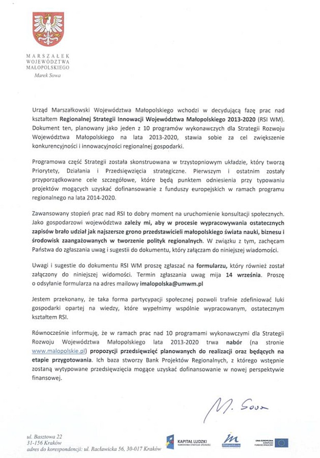 Marszałek Województwa Małopolskiego Marek Sowa zaprasza przedstwicieli sądeckiego świata nauki, biznesu i środowisk zaangażowanych w tworzenie polityk regionalnych oraz wszystkich zainteresowanych do konsultacji projektu założeń programu strategicznego pn. „Regionalna Strategia Innowacji Województwa Małopolskiego 2013 -2020”, zatwierdzonego przez Zarząd Województwa Małopolskiego w dniu 28.06.2012 roku.