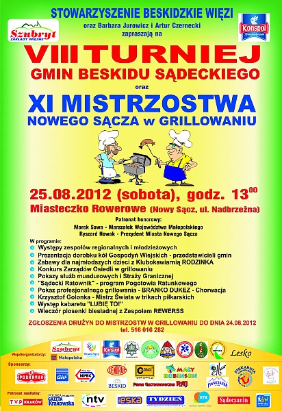 Zapraszamy na VIII Turniej Gmin Beskidu Sądeckiego oraz XI Mistrzostwa Nowego Sącza w Grillowaniu, które odbędą się w sobotę 25 sierpnia, na terenie Miasteczka Rowerowego, przy ulicy Nadbrzeżnej w Nowym Sączu. Początek imprezy o godz. 13.00. Zgłoszenia drużyn do mistrzostw mogą napływać do dnia 24 sierpnia pod numer telefonu: 516 016 282.