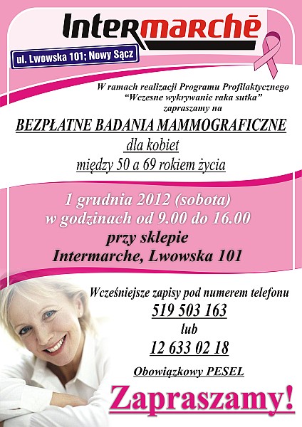 Sklep „Intermarche” przy ul. Lwowskiej 101 w Nowym Sączu ufundował 50 bezpłatnych badań dla kobiet w wieku powyżej 40 lat. Kupony na badania będą losowane wśród klientek sklepu.