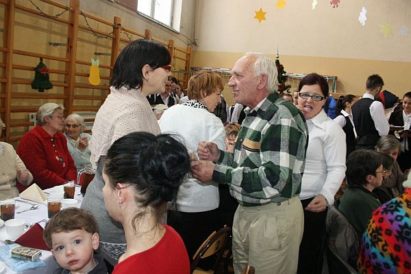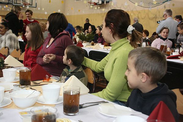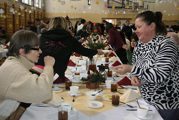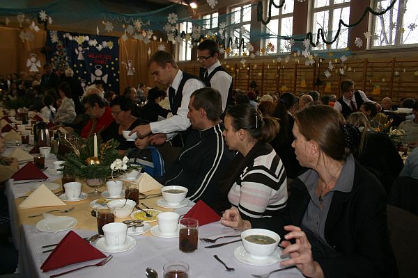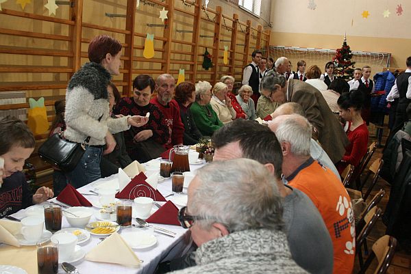 Zupę grzybową, rybę z ziemniakami, kapustę z grochem i świąteczne ciasto przygotowano na wigilijny obiad, do którego zasiedli najbardziej potrzebujący mieszkańcy naszego miasta. W sumie w Zespole Szkół nr 1 spotkało się ponad 200 osób. Ksiądz prałat Jan Siedlarz pobłogosławił opłatki i przygotowane potrawy. Wiceprezydent Bożena Jawor życzyła w imieniu władz miasta prawdziwej miłości, która płynie od żłóbka betlejemskiego. „Jan Paweł II napisał „miłość mi wszystko wyjaśniła”, jeżeli nie będzie miłości to nie będzie dobra - mówiła wiceprezydent Bożena Jawor. Życzę państwu abyśmy nawzajem byli dla siebie dobrzy ponieważ tego dobra i miłości tak bardzo potrzeba. Życzę zdrowia, szczęścia i życzę abyście spotykali ludzi dobrych i uczciwych.” Wiceprezydent podziękowała dyrekcji i uczniom gastronoma za przygotowanie wigilii. Później był czas na indywidualne życzenia.