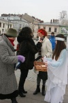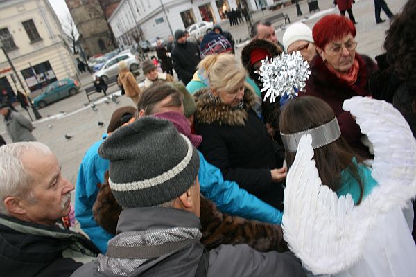 Później był czas na składanie życzeń. Aniołki rozdawały woreczki z siankiem na wigilijny stół, a mieszkańcy słuchając kolęd w wykonaniu artystów z MOK składali sobie życzenia.