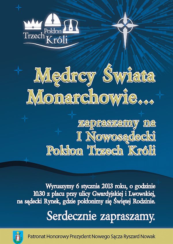 W najbliższą niedzielę, 6 stycznia 2013 roku po raz pierwszy zorganizowany zostanie Nowosądecki Pokłon Trzech Króli. Zapraszamy wszystkich mieszkańców do udziału w tym spotkaniu. „Orszak wyruszy o godz. 10.30 z placu przy ul. Gwardyjskiej i Lwowskiej i przejdzie do Rynku, gdzie czekać będzie Święta Rodzina. Wszyscy pokłonimy się maleńkiemu Jezuskowi, a szopka i sceneria będą niezwykłe - zapewnia wiceprezydent Bożena Jawor. Nie zabraknie zwierząt: kucyka, osiołka, kozy nigeryjskiej i owieczek”.
