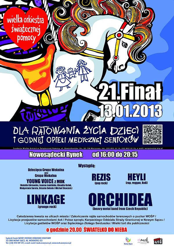 13 stycznia 2013 roku po raz 21 zagra Wielka Orkiestra Świątecznej Pomocy. Na sądeckim Rynku bawić się będziemy od godz. 16.00. Zagrają Dziecięca Grupa Wokalna oraz Grupa Wokalna Young Voice z MOK, LINKAGE, REZIS, HEYLI i ORCHIDEA.