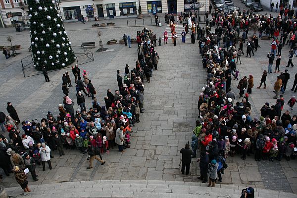 Każdy z uczestników otrzymał koronę i śpiewnik, po czym o godz. 10.30 marsz ruszył z ul. Gwardyjskiej pod nowosądecki ratusz. Orszak prowadzili Trzej Królowie. Idąc śpiewali najpiękniejsze polskie kolędy. Gdy pochód dotarł na Rynek, Trzej Królowie złożyli pokłon Świętej Rodzinie, którą zagrało małżeństwo z półrocznym dzieckiem. Dzieci nie mogły oderwać oczu od stajenki, gdzie były zwierzęta, które specjalnie na to wydarzenie przybyły z gospodarstwa w Żeleźnikowej Wielkiej. Przed ratuszem dla tych, którzy nie uczestniczyli w marszu przygotowano jasełka w wykonaniu nauczycieli z Zespołu Szkół Ekonomicznych.