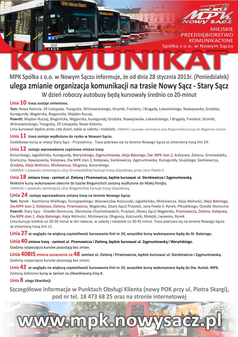 Miejskie Przedsiębiorstwo Komunikacyjne Spółka z o.o. w Nowym Sączu informuje, że od dnia 28 stycznia 2013 roku zmianie ulega organizacja komunikacji na trasie Nowy Sącz – Stary Sącz. W dzień roboczy autobusy będą kursowały średnio co 20 minut. Szczegółowe informacje na plakacie poniżej.
